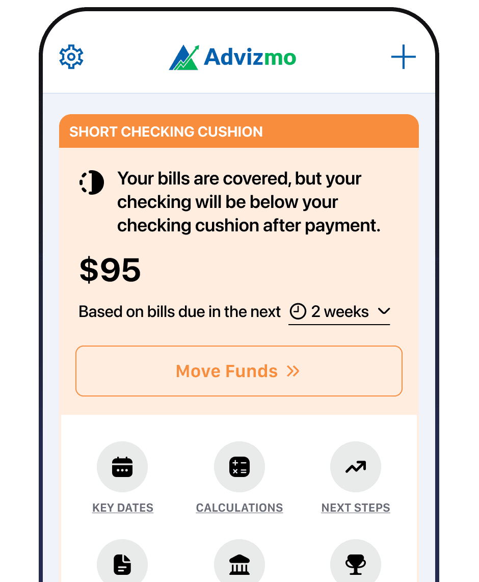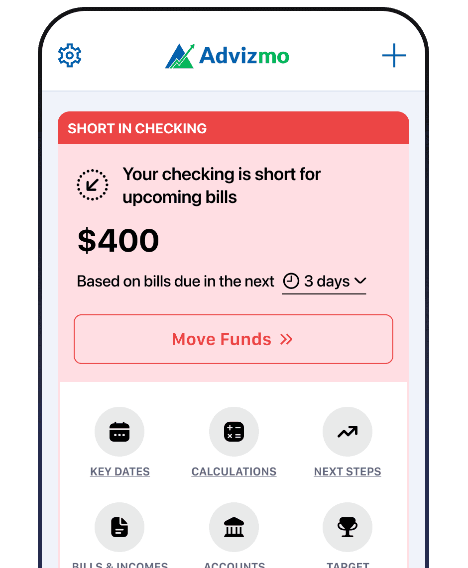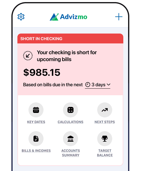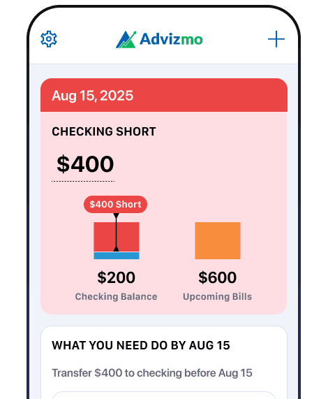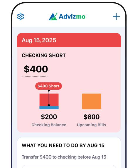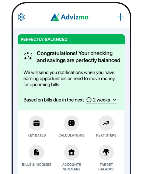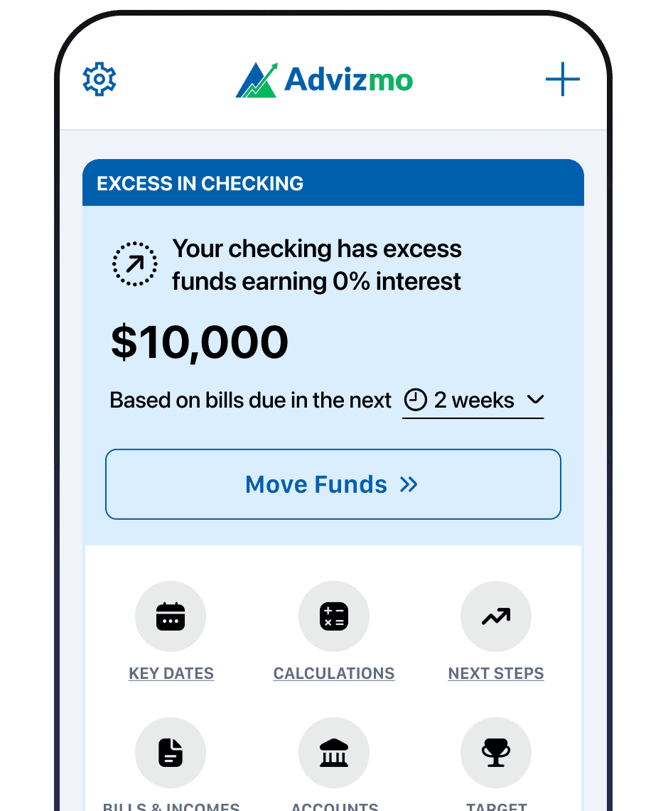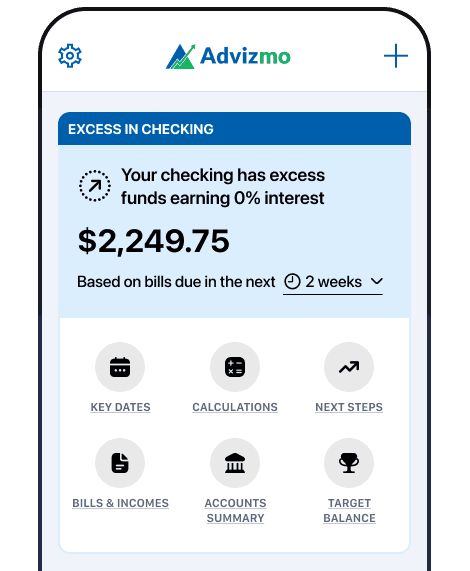 Advizmo analyzes all your bank accounts daily, identifying excess funds earning 0% interest and alerting you if your checking account is short for upcoming bills. No spreadsheets, no guessing, just clear financial insights.