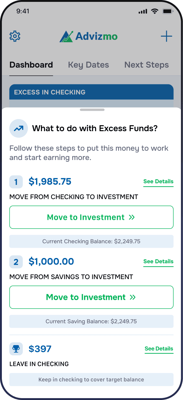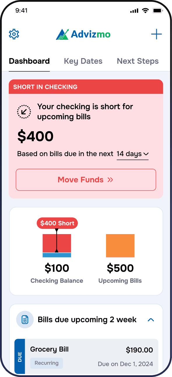 Advizmo monitors your checking balance and upcoming bills 24/7. Idle cash gets invested automatically. Shortfalls get flagged instantly.