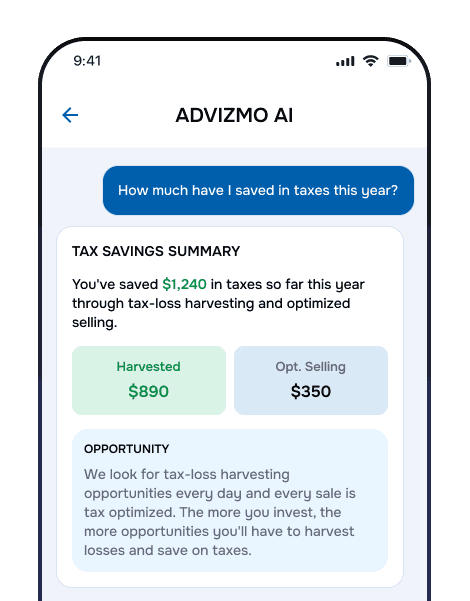 They stop at portfolio management. Advizmo automates the entire journey from paycheck to portfolio, and gives you smarter tax-optimized selling when you need your money back.