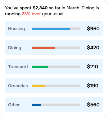 Get instant, personalized answers based on your actual accounts, spending, and goals. Not generic advice: your data, your insights.