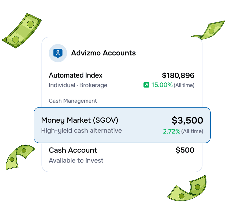 * Estimates only. Not financial advice. Bank APY 0.07%. Market return 7%/yr. Advizmo tax alpha 1.5%/yr based on Vanguard (2022), J.P. Morgan (2023), and MIT Sloan (2012) research on tax-efficient investing strategies. All idle cash invested at 8.5%/yr with Advizmo. Individual results vary. Past performance does not guarantee future results. Not tax advice. References do not constitute endorsements of Advizmo.
